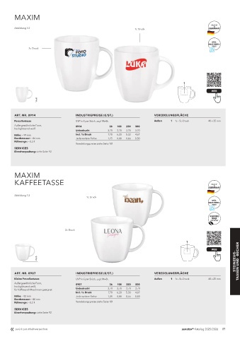 Porzellantasse UVP in € per Stück, zzgl. MwSt. Außen 1 1c – 5c-Druck 40 x 35 mm